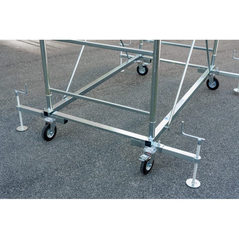 Rusztowanie jest wyposażone w 4 koła jezdne o średnicy 150 mm, dwa wyposażone w hamulce, wykonane z wytrzymałego tworzywa sztucznego na stalowych jarzmach. Podesty z klapą wykonane z sklejki wodoodpornej na ramie stalowej. Burty z każdej strony zapobiegające przed upadkiem narzędzi. Krzyżowe stężenia stalowe zapewniają sztywność konstrukcji i przeciwdziałają "kołysaniu" całej konstrukcji. Zestaw można wyposażyć dodatkowo w podpory, zestawy kotwiące czy np. w dodatkowe podesty.