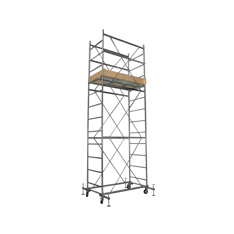 Rusztowanie jest wyposażone w 4 koła jezdne o średnicy 150 mm, dwa wyposażone w hamulce, wykonane z wytrzymałego tworzywa sztucznego na stalowych jarzmach. Podesty z klapą wykonane z sklejki wodoodpornej na ramie stalowej. Burty z każdej strony zapobiegające przed upadkiem narzędzi. Krzyżowe stężenia stalowe zapewniają sztywność konstrukcji i przeciwdziałają "kołysaniu" całej konstrukcji. Zestaw można wyposażyć dodatkowo w podpory, zestawy kotwiące czy np. w dodatkowe podesty.